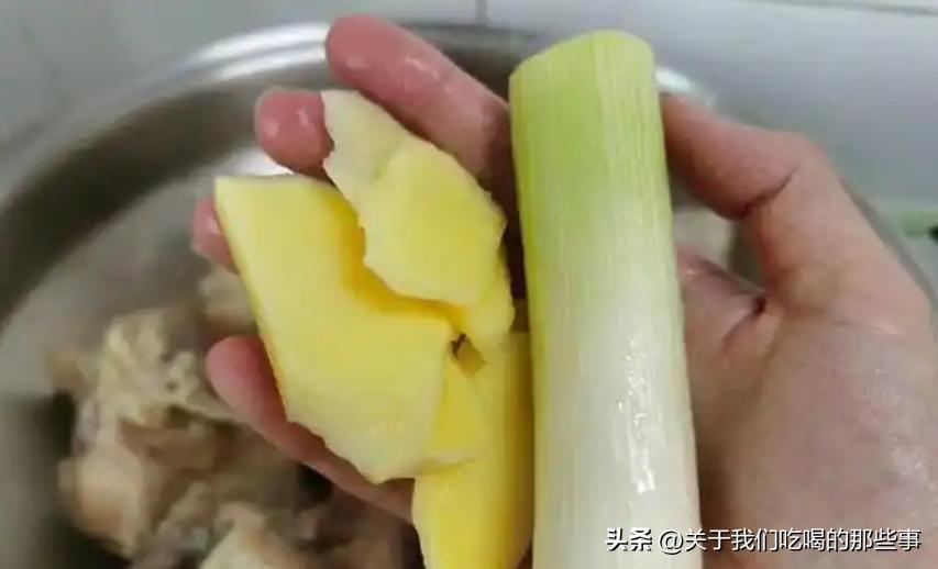 - 煮5分鐘左右,用勺子把煮出來的血沫子都撇掉,不撇的話腥味大得很。血沫子撇乾淨後撈出羊肉和腿骨,用溫水沖洗兩遍,瀝乾備用。不要用冷水沖洗熱羊肉,這樣羊肉會變柴,口感大打折扣。大蔥剝洗乾淨切段,黃姜洗淨切片。