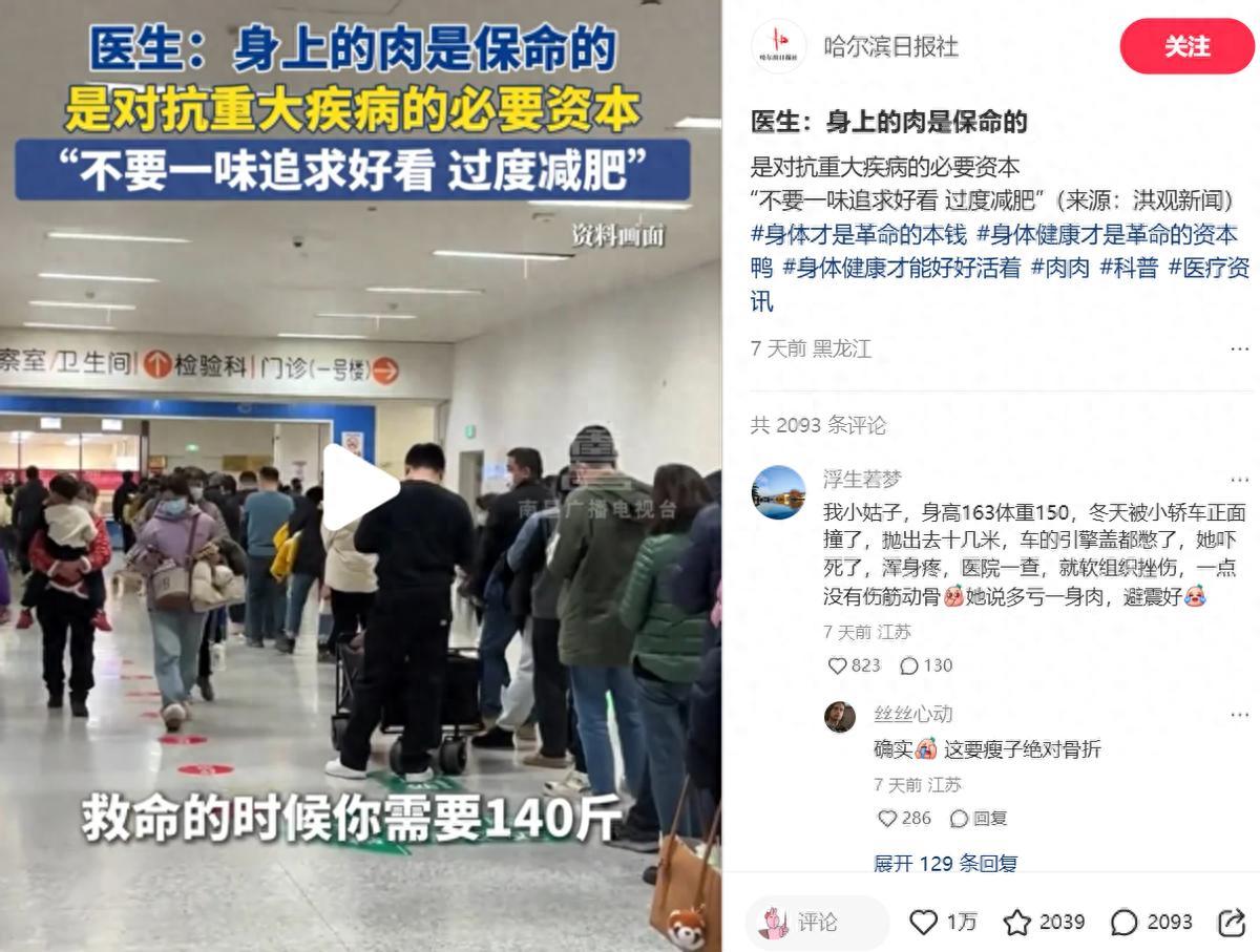 前不久,演員金靖在公開採訪中呼籲,女生要有點脂肪,像自己孕期劇烈嘔吐時,就多虧了身上的“肉肉”,纔有足夠的體力挺過那段艱難的時光。一位三甲醫院醫生也稱:“同樣病重,160斤的七旬老人比90來斤的年輕人更有抗病資本。”