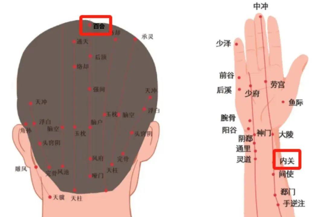 百會穴是調節大腦功能的要穴。“百會”意指手足三陽經及督脈的陽氣在此交會。該穴位於前髮際正中直上5寸(中指中節屈曲時內側兩端紋頭之間的距離或者拇指指間關節的寬度,爲1寸)處。按摩該穴可昇陽醒腦,改善頭部血液循環。內關穴是手厥陰心包經的絡穴,位於前臂正中,腕橫紋上2寸處。按摩該穴可醒腦開竅。