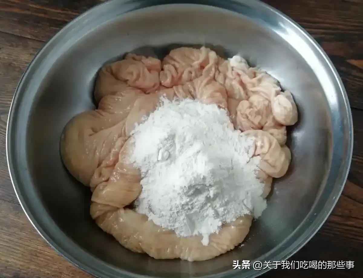 2、盆內不加水,倒入一大勺麪粉或者澱粉,用手反覆地搓揉,至少五分鐘。加入麪粉或者澱粉,是因爲它們有很強的吸附性,這樣不斷的抓揉,可以將豬大腸上的髒東西和粘液去掉。