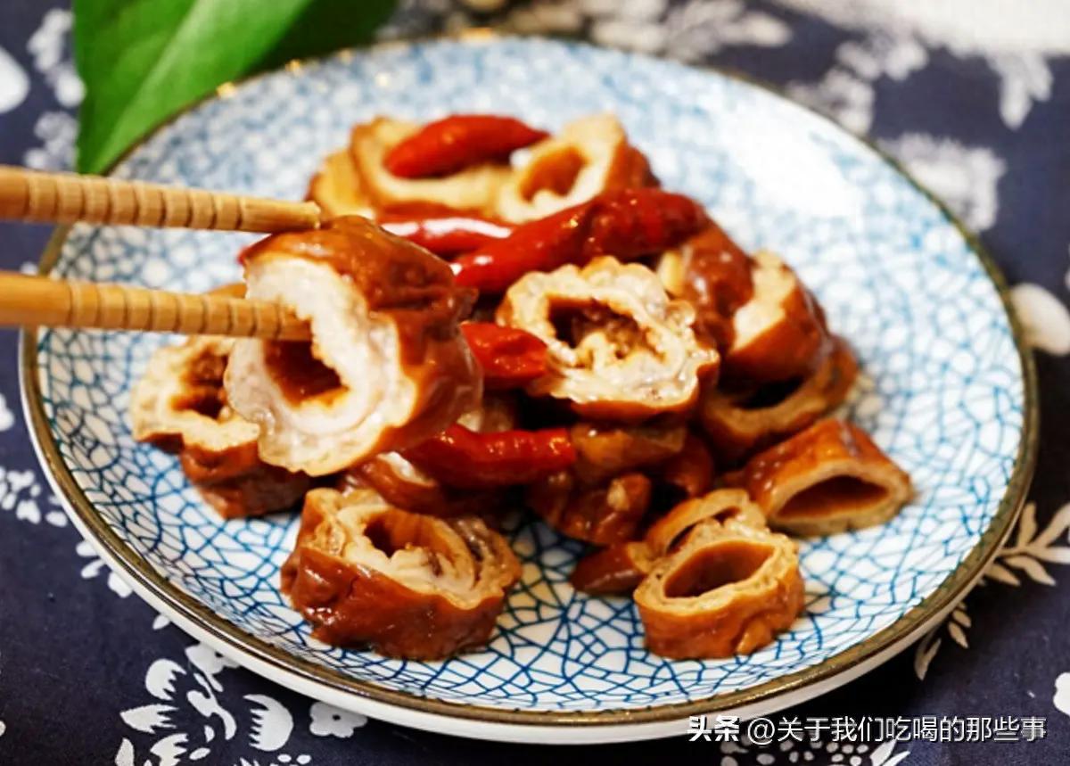 煮好了不撈出,繼續浸泡着,讓豬大腸入味。泡好後取出,切成小塊,可以蘸汁直接喫,也可以搭配食材炒着喫。