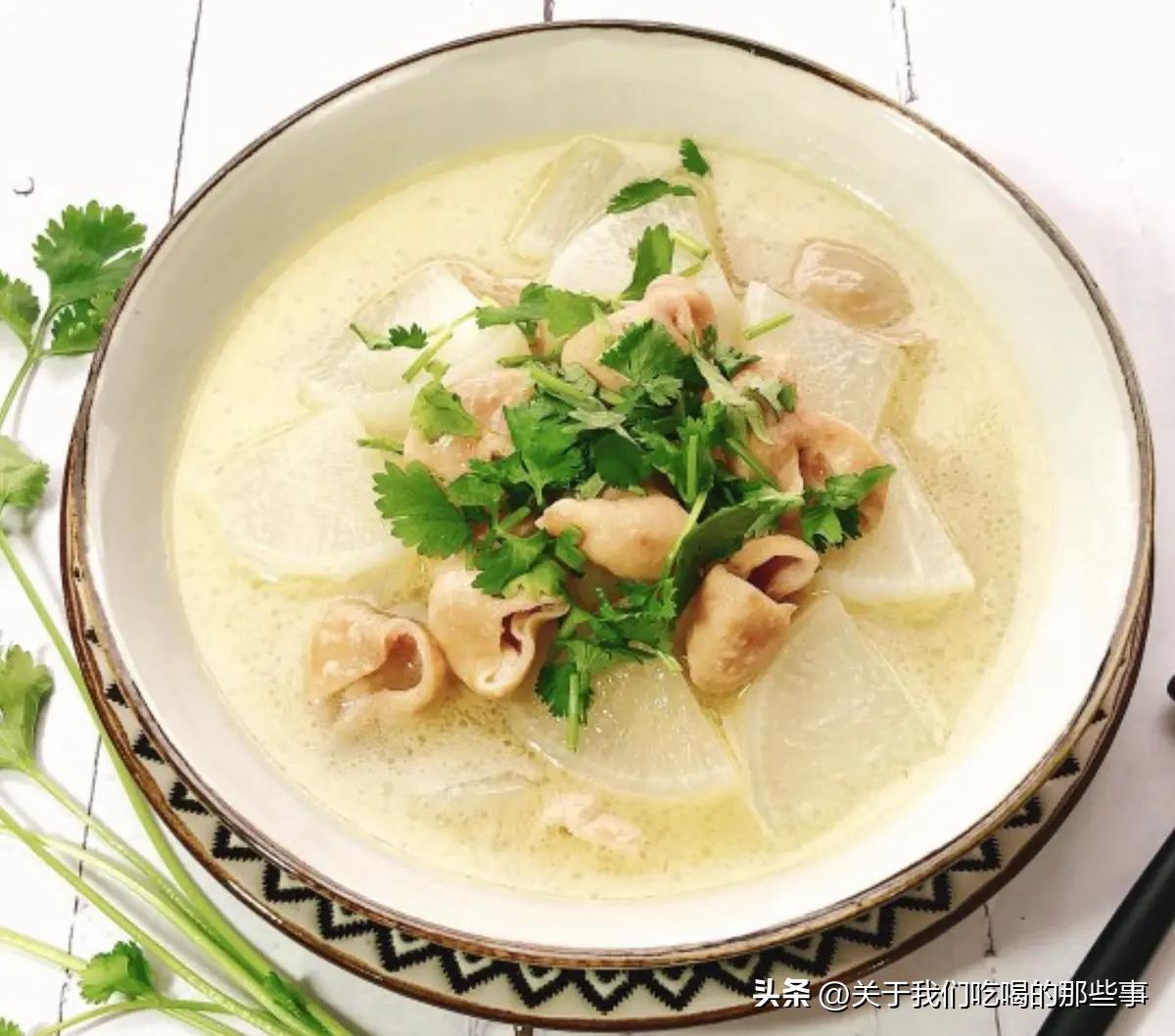 最後放入白蘿蔔塊和少許鹽,繼續煮一會兒,至白蘿蔔變軟。煮好後,加入少許白胡椒粉攪拌,就可以關火了,盛出後加入香菜碎食用。