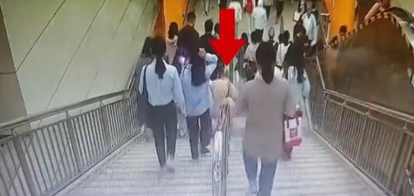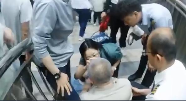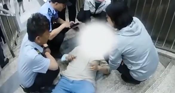 事發當天晚高峯,一位老人在地鐵5號線東單站樓梯處突然倒地,仰面躺在了樓梯上。