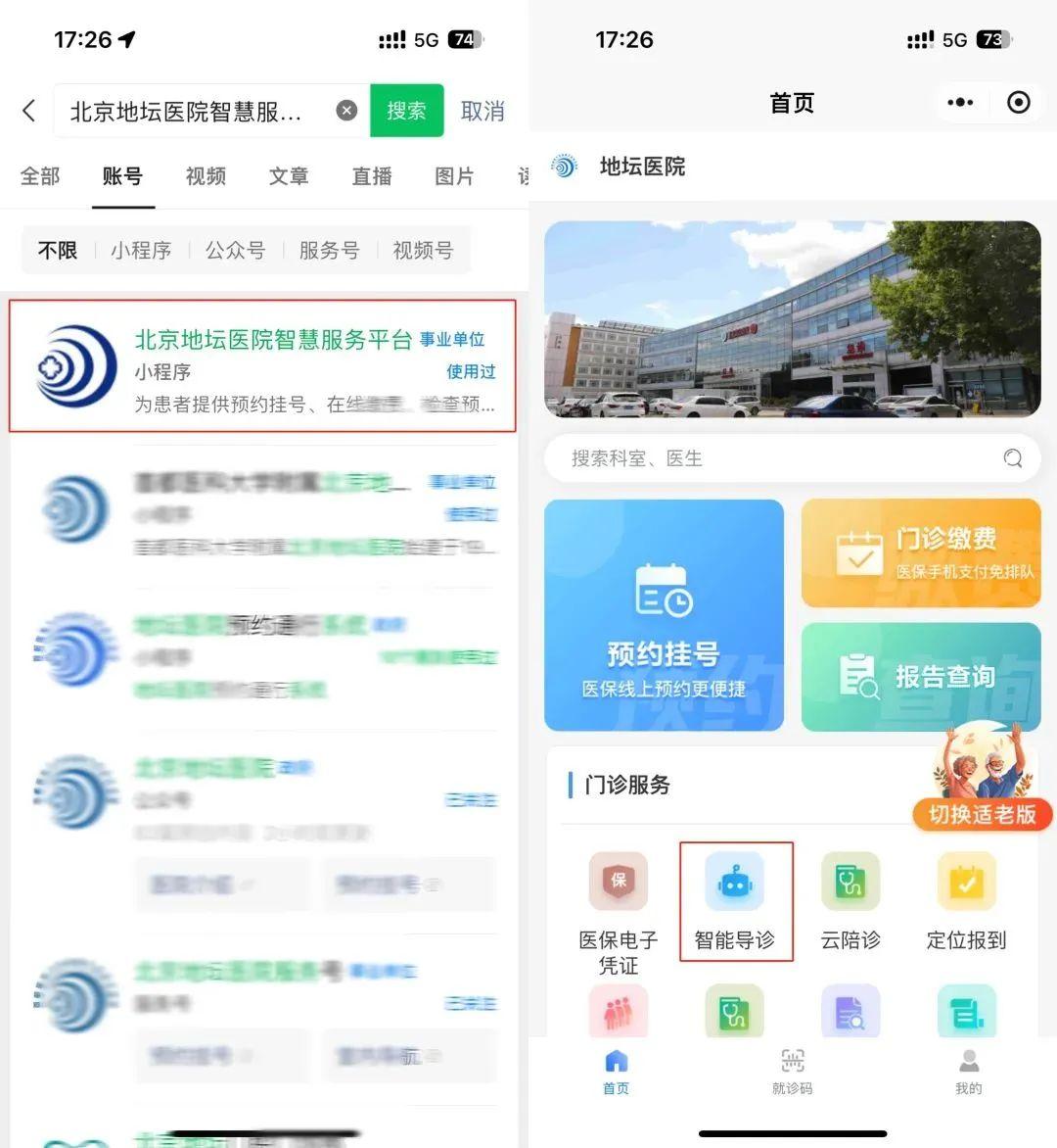 微信搜索或者掃描下方二維碼進入“北京地壇醫院智慧服務平臺”小程序,在門診服務中選擇“智能導診”。