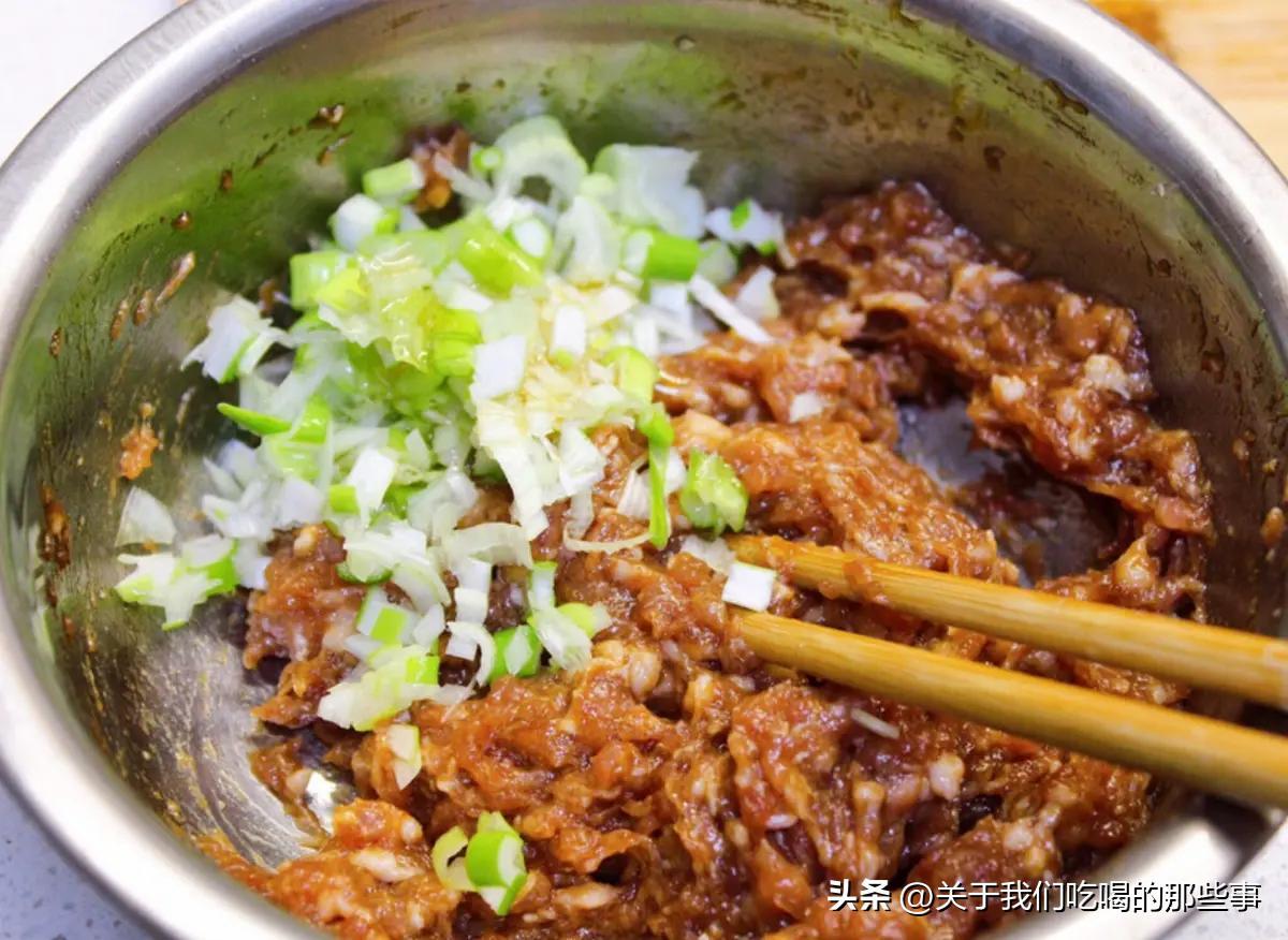 5、拌好後打入雞蛋,攪拌上勁,再加入少許蔥末、香油攪拌,餡料就調好了。