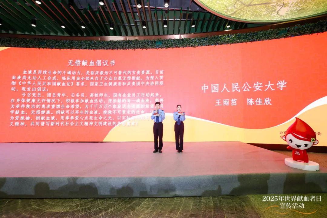 中國人民公安大學碩士研究生王雨茁、陳佳欣上臺宣讀國家衛生健康委和共青團中央印發的《無償獻血倡議書》,號召黨員、團員青年、公務員、高校師生、國有企業員工行動起來,在身體健康允許情況下,積極參加獻血活動。