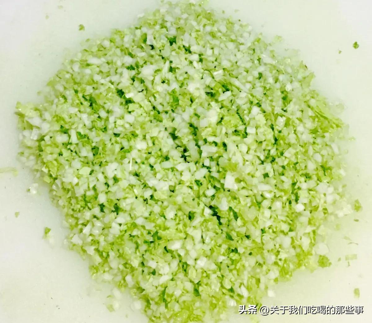 白菜醃製後,用紗布包裹,擠壓出水分。處理好了放進肉餡中,攪拌均勻。