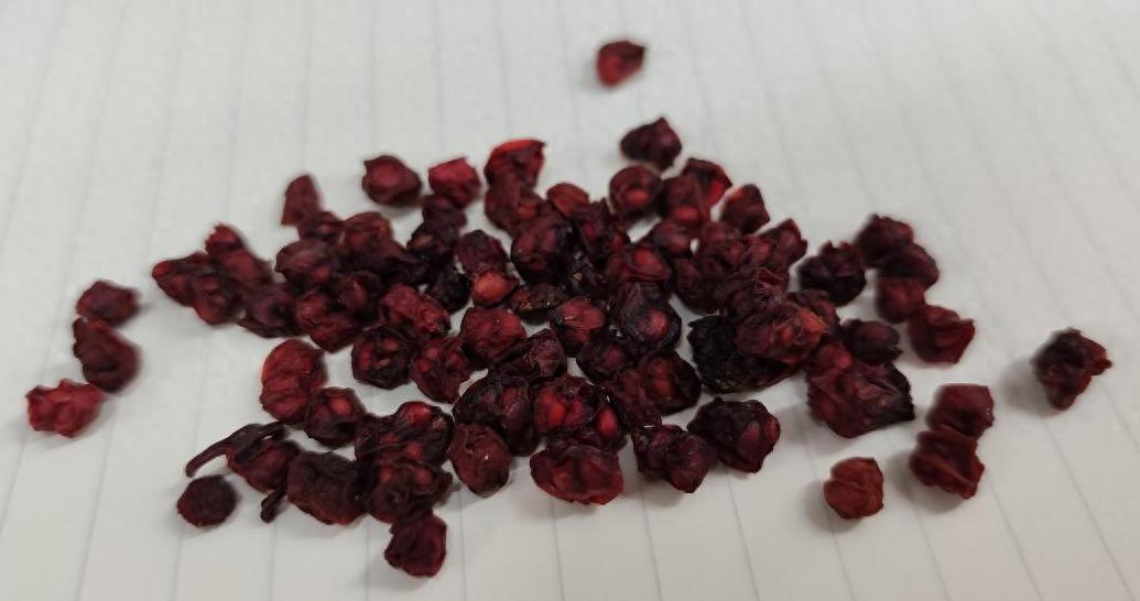 【性狀】 本品呈不規則球形或扁球形,直徑5~8 mm。表面紅色、紫紅色或暗紅色,皺縮,顯油潤;有的表面黑紅色或出現“白霜”。果肉柔軟,種子1~2粒,腎形,表面棕黃色,有光澤,種皮薄而脆。果肉氣微,味酸;種子破碎後,有香氣,味辛、微苦。質量要求:以粒大、色紫紅、肉厚、質柔潤、味酸者爲佳。