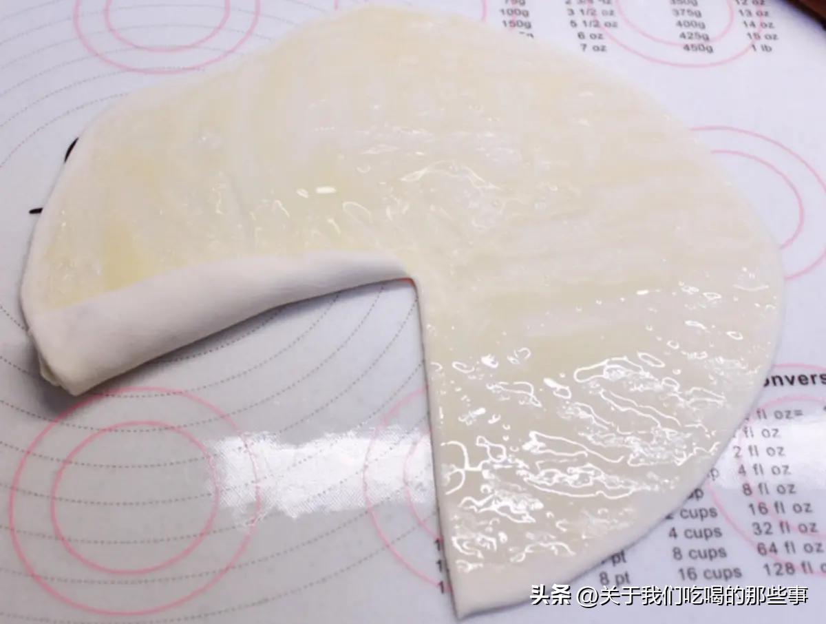 7、醒面後取出麪糰,擀成薄薄的圓形,再淋上油酥塗抹均勻。