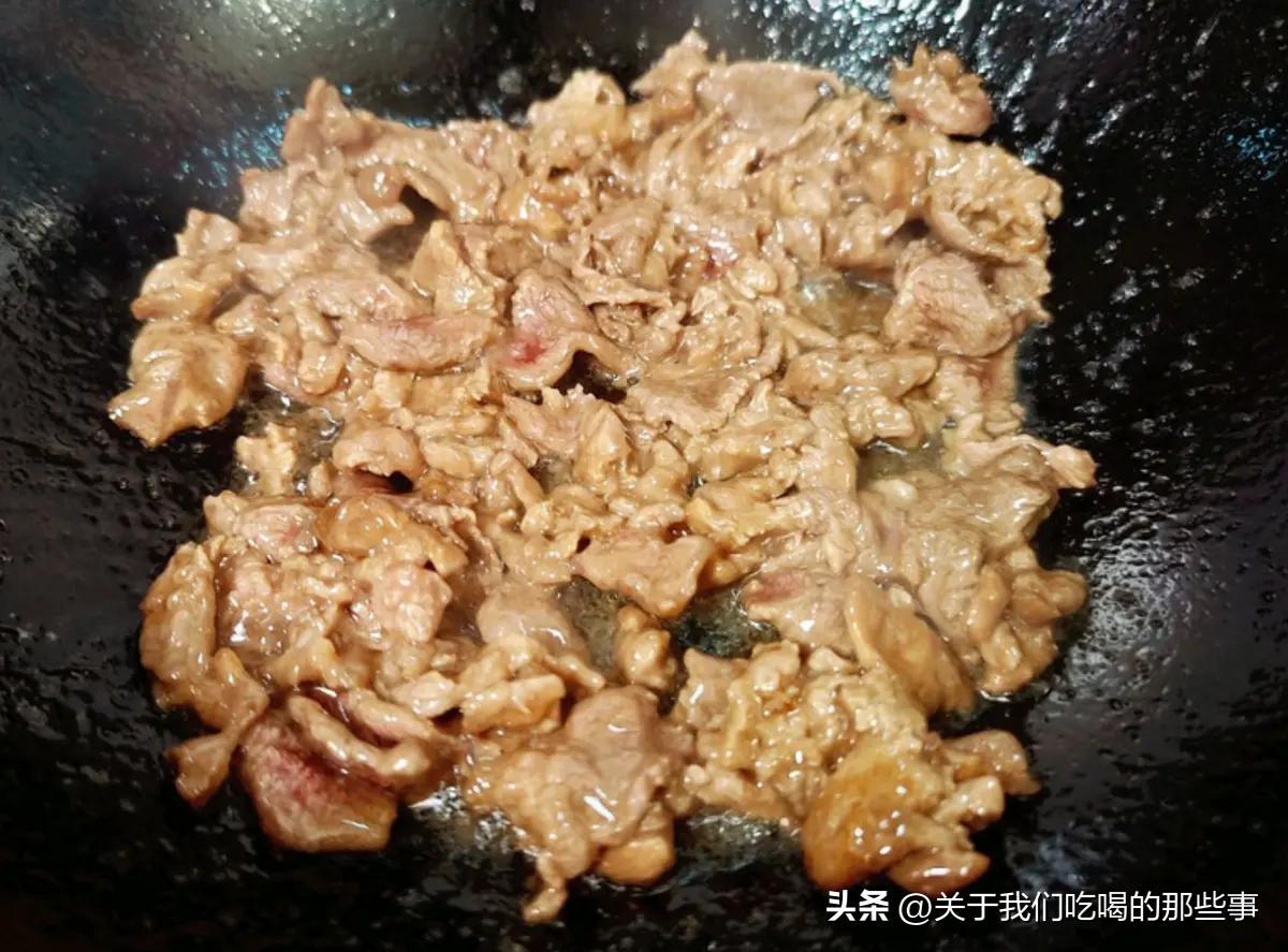 5、鍋內加油,量要多一點,一邊加熱一邊晃動,讓油鋪滿鍋面並均勻受熱,燒到微微冒煙後關火,等油溫熱了再加熱到五六成熱,把肉片倒進鍋內,炒到散開,完全變色。炒好後盛出,不要留在鍋內。(這樣做可以避免粘鍋脫漿)