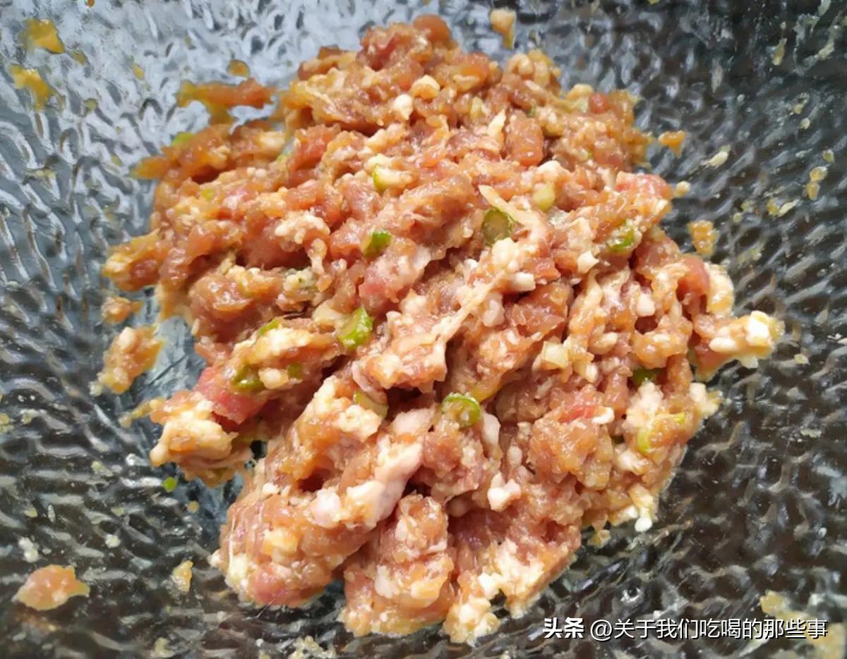 調味後,加入蛋清和一小勺澱粉攪拌均勻,再加入少許蔥花攪拌均勻,處理好後放一邊醃製。記得加少許澱粉,會使肉餡更嫩。