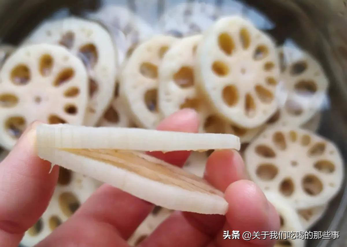 蓮藕清洗乾淨,去掉兩頭和外皮,再切成連刀片。全部切好了,放進盆內清洗一遍,瀝水。