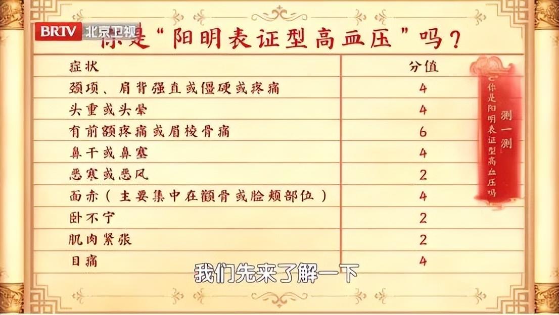 陽明表證型高血壓的症狀和經絡運行相關,頸項、肩背,是手陽明大腸經循行的部位;陽明經還會循行到鼻翼兩側,包括迎香穴、四白穴、巨髎穴的部位;前額、眉棱骨,是隻有陽明經會干預到的部位,所以前額痛、眉棱骨痛具有特異性。