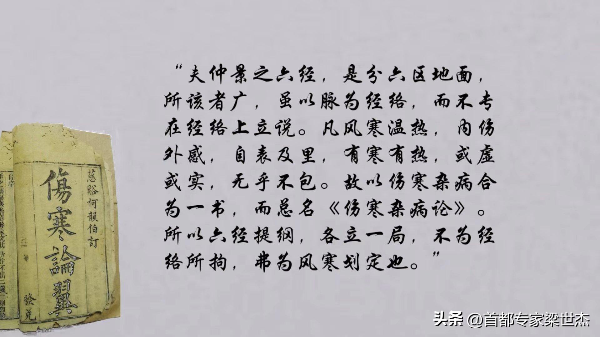 柯韻伯在《傷寒論翼》中曾言:“夫仲景之六經,是分六區地面,所該者廣,雖以脈爲經絡,而不專在經絡上立說。凡風寒溫熱,內傷外感,自表及裏,有寒有熱,或虛或實,無乎不包。故以傷寒雜病合爲一書,而總名《傷寒雜病論》。所以六經提綱,各立一局,不爲經絡所拘,弗爲風寒劃定也。”在柯韻伯眼中,仲景的六經就如同劃分了六個不同的區域,其涵蓋的範圍極爲廣泛,並非僅僅侷限於經絡的範疇。
