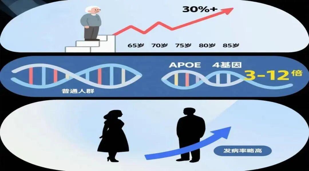 癡呆的危險因素分“不可控”和“可控”兩類。不可控因素是我們無法改變的客觀條件,主要有三個:一是年齡,65歲後癡呆發病率每5年翻倍,85歲以上人羣風險超過30%;二是遺傳,直系親屬患病者風險更高,攜帶APOE ε4基因者患病概率是普通人的3~12倍;三是性別,女性因壽命更長、絕經後雌激素變化,發病率略高於男性。