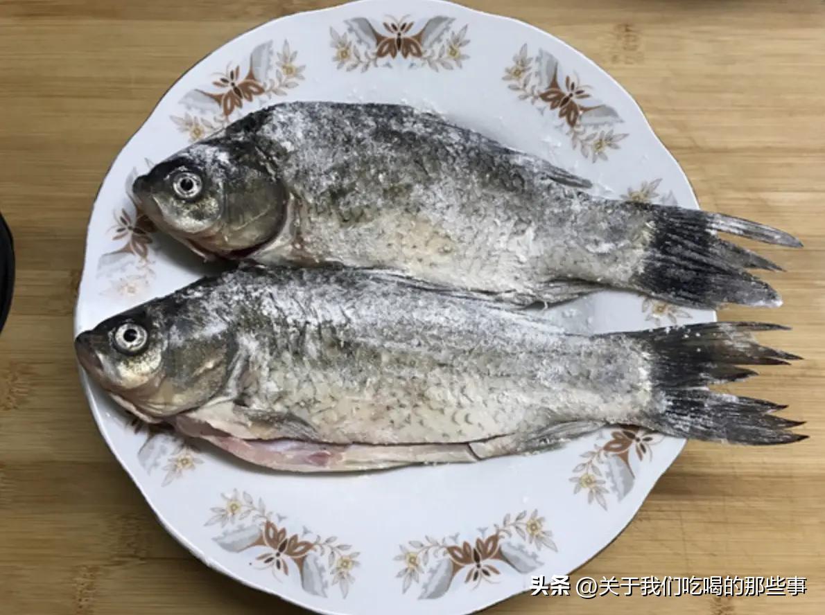 接着給魚兩面撒上面粉,魚頭和魚尾也別放過。處理好了,提起來輕輕拍一拍,讓多餘的麪粉掉落,留下薄薄一層就好了。