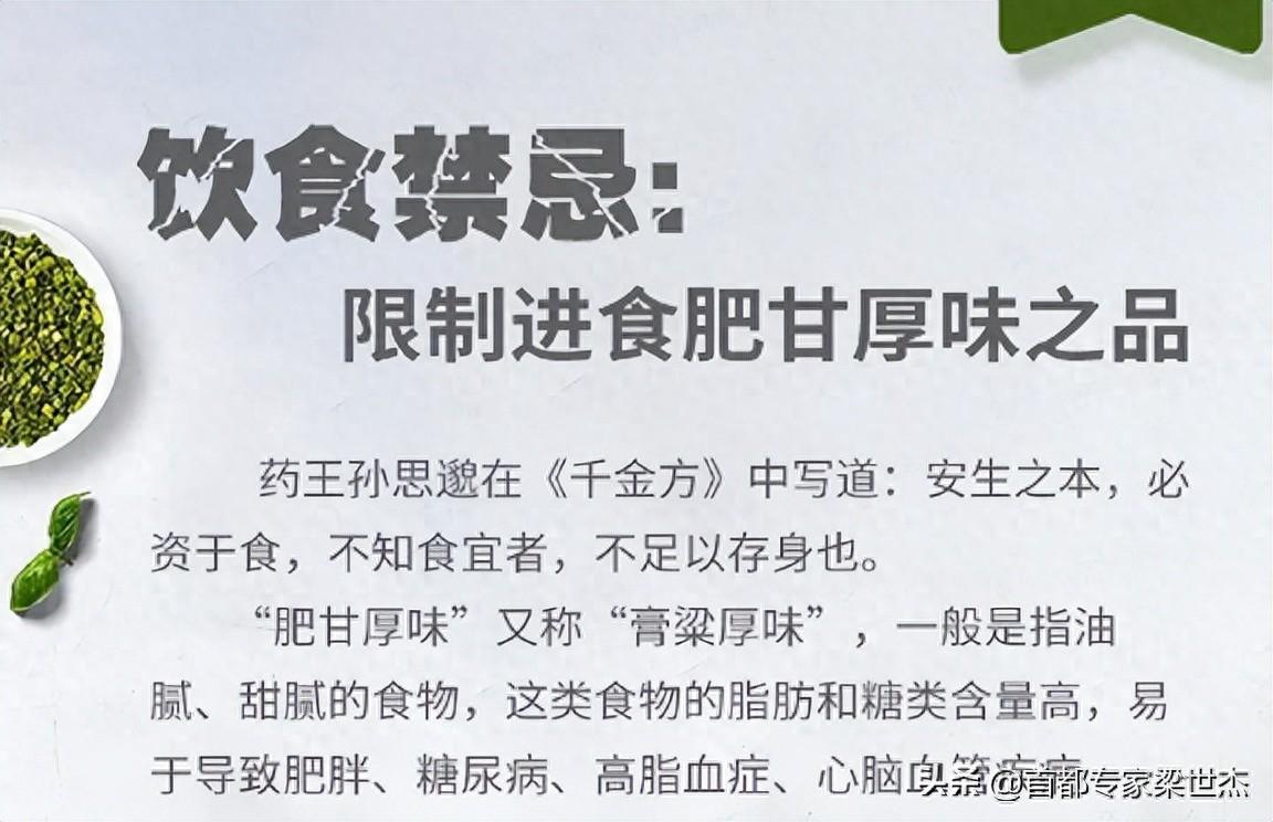 梁世傑醫生在爲患者調理疾病時,就非常注重忌嘴方法。對於胃病患者,玉米、紅薯、菠菜等看似健康的食物,卻可能因爲其偏黏偏硬的特性,加重脾胃的負擔,所以都要忌口。生冷的食物和油膩的肉食更是不能碰,飲食只能喫到八成飽。糖尿病患者要遠離各種肉食、甜食、乾果等,大米稀飯也不能喝,飲食控制在七成飽。痛風患者則要忌食各種肉食、海鮮、甜食、乾果等。