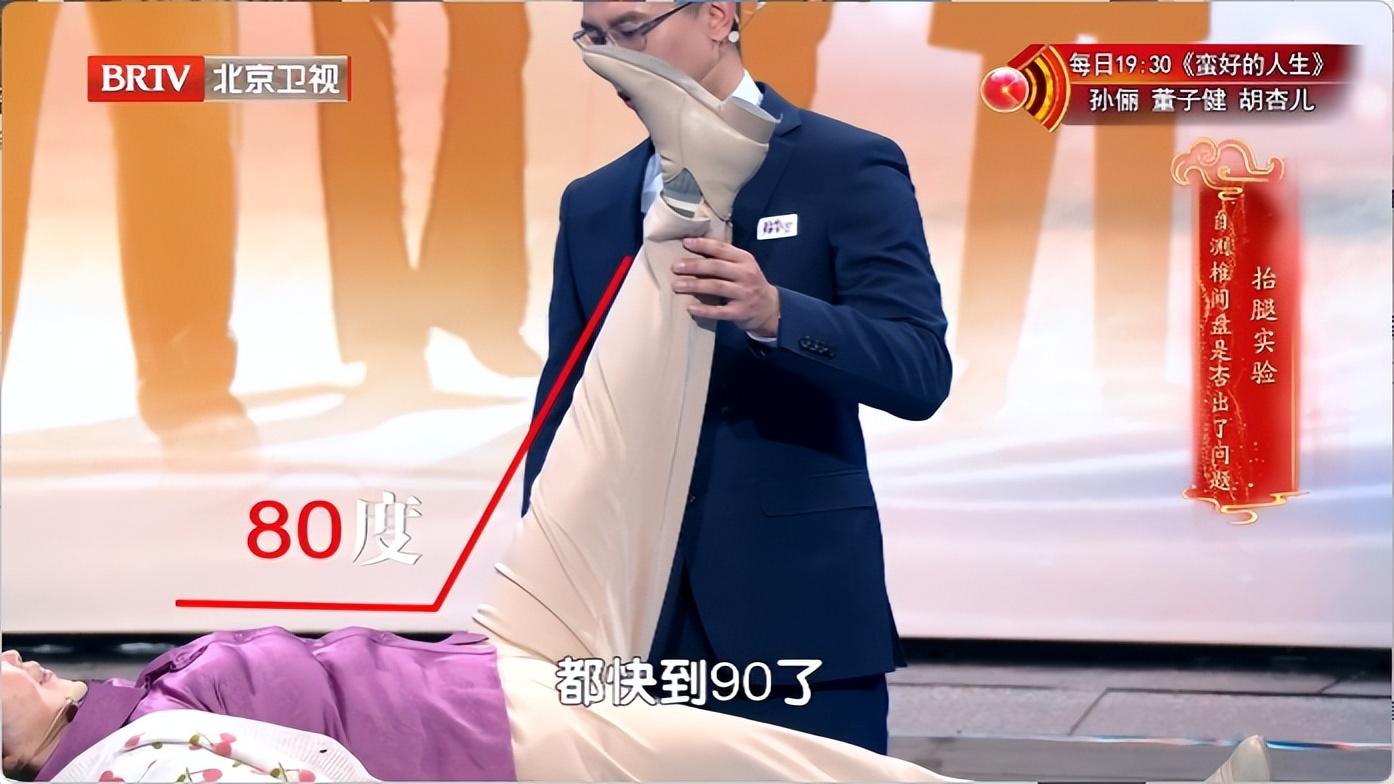 將膝蓋伸直、抬腿,越靠近90°,代表腰椎間盤越健康;