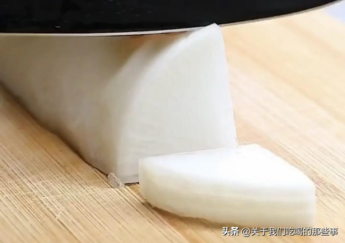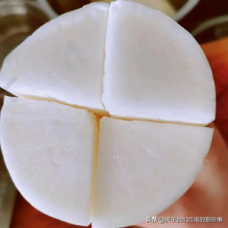 然後將白蘿蔔切成四份,從切面看呈扇形。切好了取一份切片,切的時候連切兩刀或者三刀不切斷,第三刀或者第四刀切斷,這樣切出來不僅好看,還口感好。如果實在嫌麻煩,也可以直接切片,不切太薄就行。