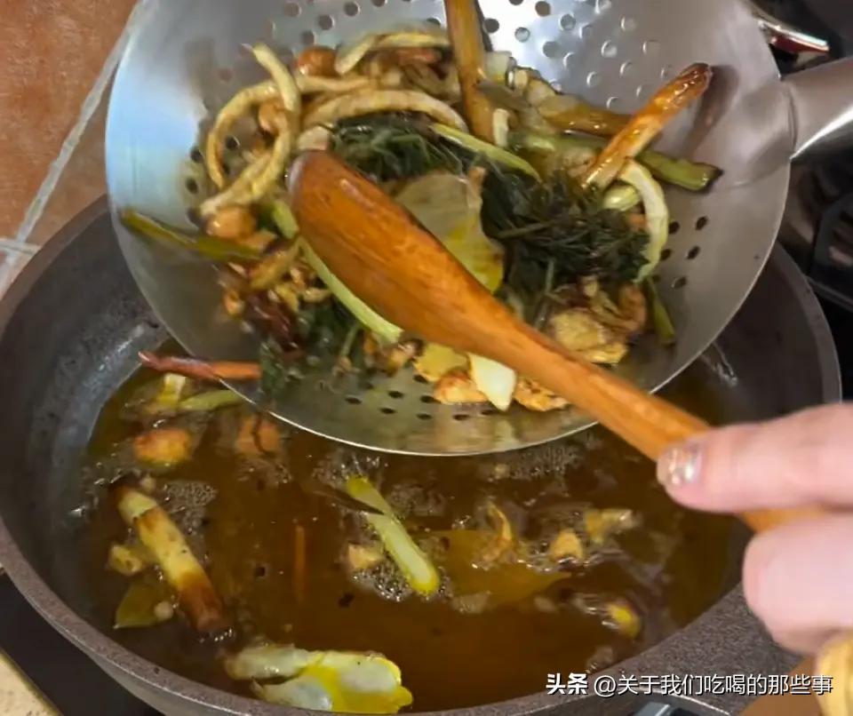 鍋內加油開火,把蔬菜部分和香料部分都放進去,小火慢炸,時不時撥動幾下,受熱均勻,充分炸出香味。一直炸到表面金黃,用漏勺撈出,讓油變得乾淨無渣。