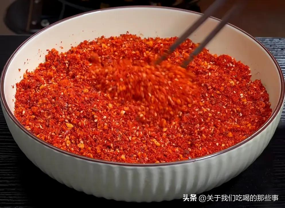 第一,辣椒麪要用白酒和油拌一拌,溼潤一下,不要直接倒熱油,以免炸糊;