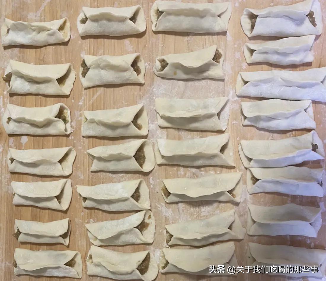 接着放入肉餡,摺疊後中間捏緊,兩頭不捏。