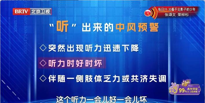 除此之外,突然出現聽力迅速下降,以及聽力時好時壞,也是中風的預警信號。