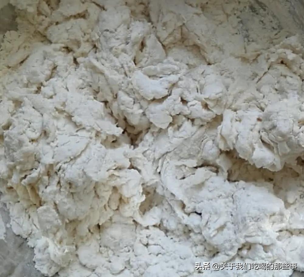 盆中加入五百克麪粉,將酵母水倒進去,一邊倒一邊攪拌,盆內變成面絮狀。