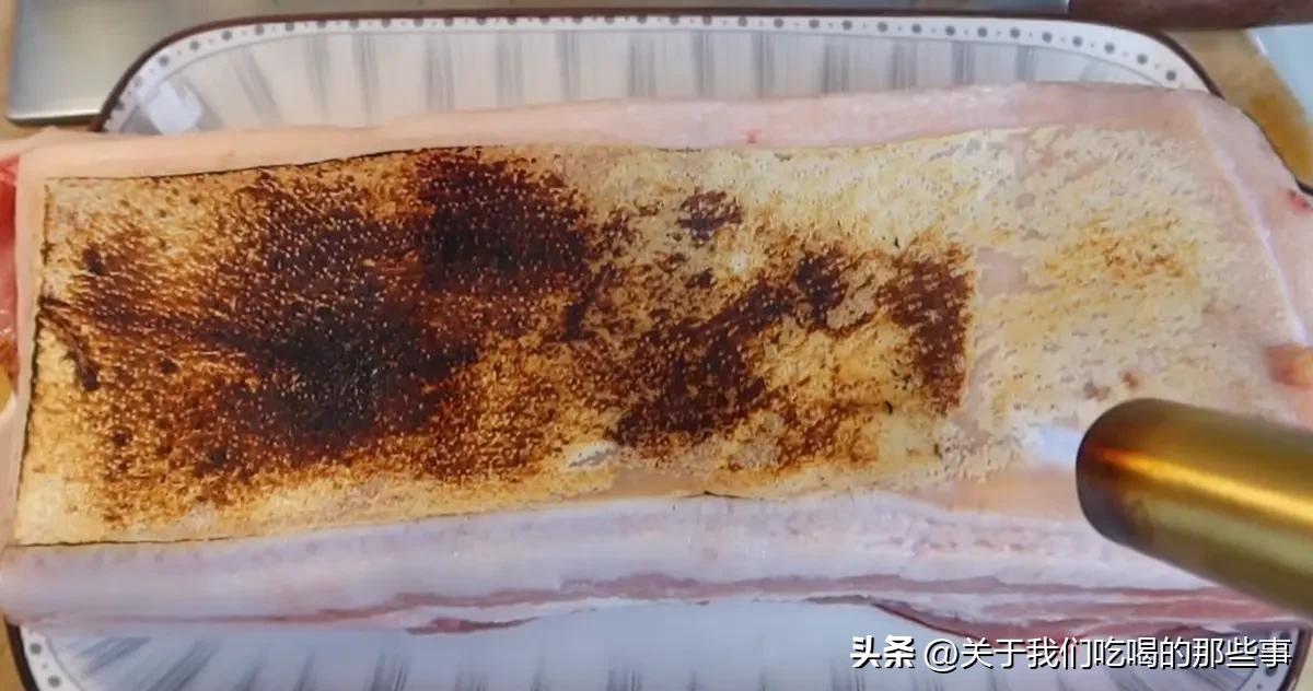 這一步就是五花肉要放在鐵鍋上燙一燙,豬皮朝下,燙的過程中將豬毛燒掉,去掉腥氣,這一步處理好了,紅燒肉做出來肉皮部分會更加軟糯好喫,也不怕喫到豬毛膈應人,還沒有腥味,香得很。
