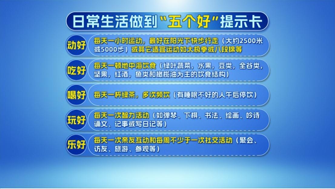 在田院士的門診中,他會給每位患者發“五個好”提示卡,這五個習慣並不難堅持,能夠幫助我們降低阿爾茨海默病的風險。