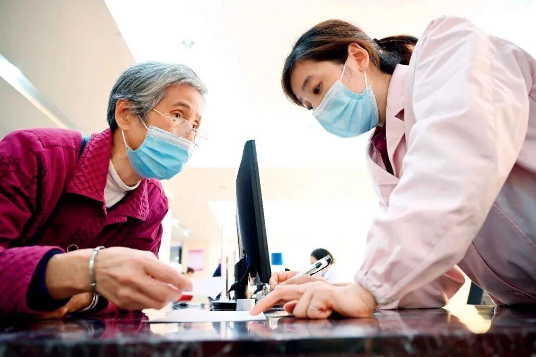 2020年11月18日,三明市第一醫院醫保辦工作人員(右)向前來諮詢藥品報銷問題的居民講解相關政策。圖/新華