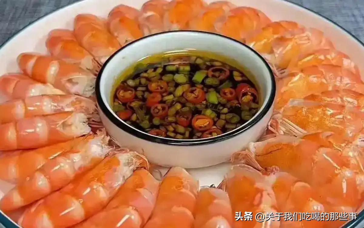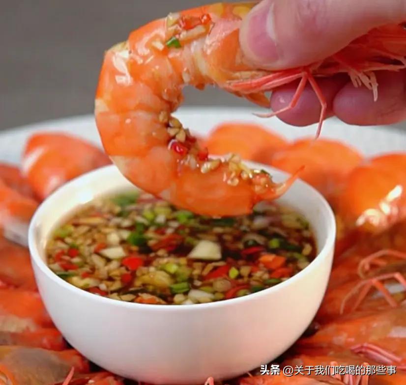 喫的時候去殼,把蝦肉放進料汁中蘸一下,特別美味。
