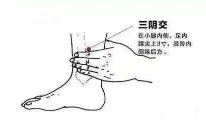 功能:三陰交能疏理肝脾養血,常用來治療月經不調、崩漏、痛經、經閉、帶下、產後腹痛、習慣性流產、乳汁缺乏等。每日按揉50~100次,以有酸脹感爲宜。
