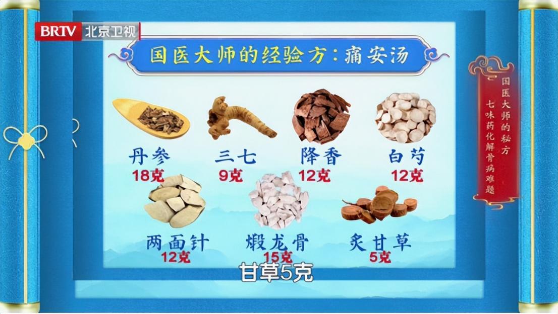 丹蔘18g,三七9g,降香12g,白芍12g,兩面針12g,煅龍骨15g,炙甘草5g