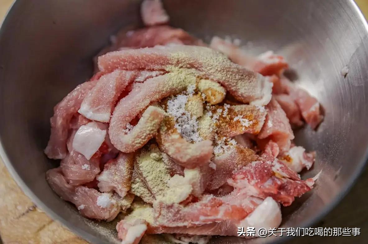 第一步,把豬肉切成稍微厚的片,再切成小粗條,不要過於細,也不要太粗,太細的話影響口感,太粗的話有炸不熟的可能。
