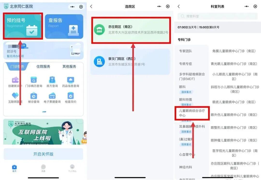 第二步:選擇“預約掛號”—“亦莊院區”—“兒童眼病綜合診療中心”,預約相應疾病門診。