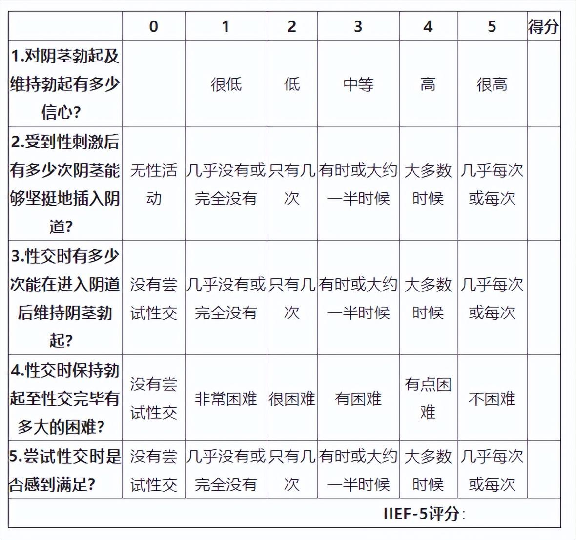 在臨牀評估中,我們會用國際勃起功能指數(IIEF-5)和勃起硬度評分(EHS)來量化 ED 嚴重程度:IIEF-5 評分>21 分、EHS=3-4 級爲勃起功能正常,能順利完成性生活;IIEF-5 評分 12-21 分、EHS=2 級爲輕度 ED,IIEF-5 評分 8-11 分、EHS=2 級爲中度 ED,IIEF-5 評分<7 分、EHS=1 級爲重度 ED。