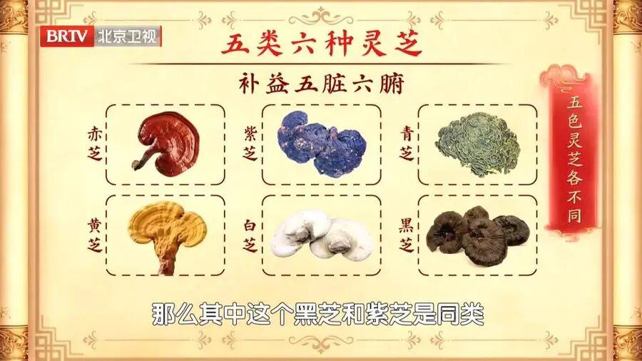 常見靈芝有五類六種,白芝入肺、黑芝入腎、青芝入肝、黃芝入脾、赤芝入心。