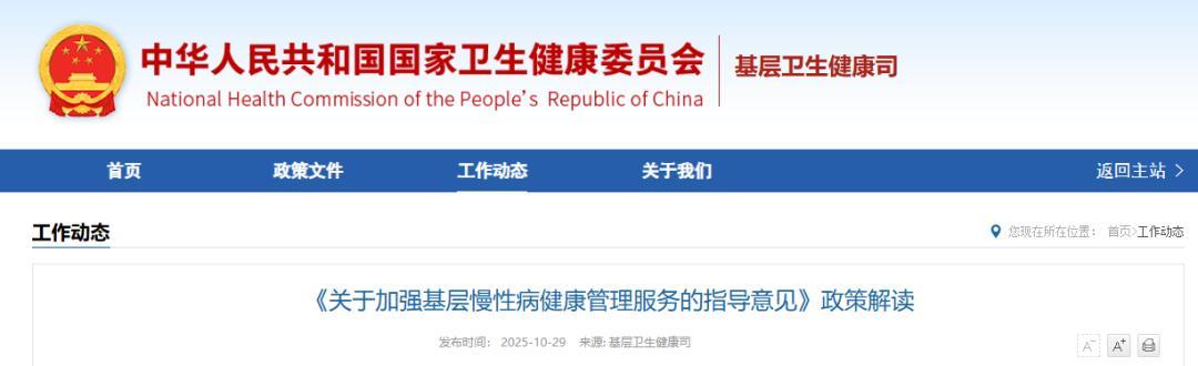 近日,國家衛生健康委會同國家發展改革委、財政部、國家醫保局、國家中醫藥局、國家疾控局5部門制定並印發《關於加強基層慢性病健康管理服務的指導意見》(以下簡稱《指導意見》)。現對《指導意見》有關情況解讀如下。