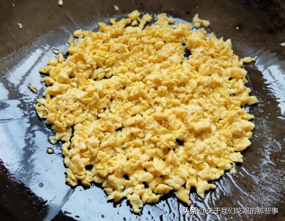 醒面期間,先來炒雞蛋,因爲雞蛋炒好有一個涼下來的過程。雞蛋液加鹽攪散,熱鍋熱油倒入蛋液,用筷子快速攪動,變成雞蛋碎的狀態了關火,再立即盛出,不要一直放在熱鍋裏,以免口感變老不嫩了。