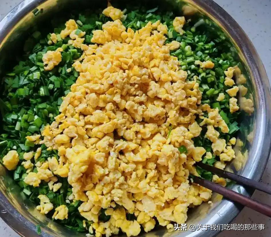 第二,想要餡料的口感好且香味濃,韭菜切碎後不要着急加鹽,而是要立即加油拌勻,鎖住水分,不然還沒包就出水了,會影響口感,鮮香味兒也會流失;