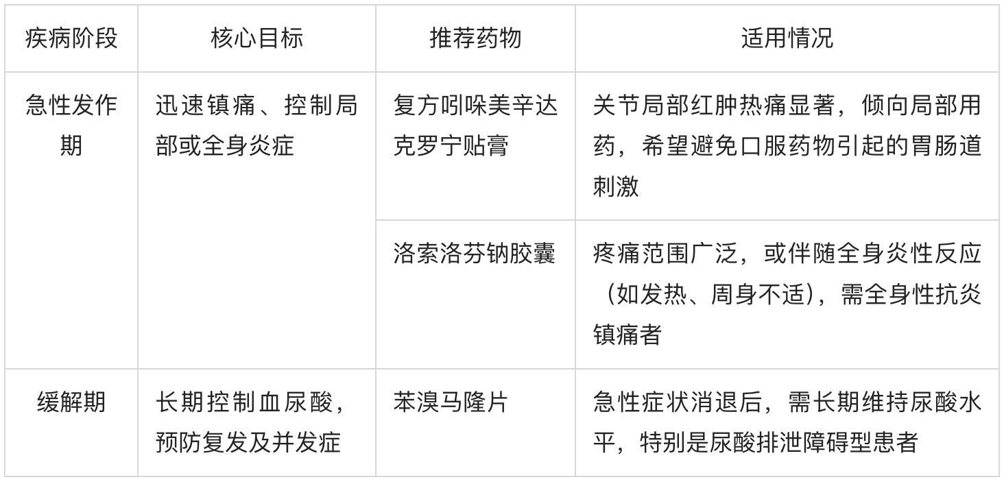 用藥提示: 痛風藥物治療應遵循“急時鎮痛,緩時降酸”的基本原則。用藥前請確認無過敏情況,並遵醫囑調整劑量。長期服藥者需定期檢測血尿酸及肝腎功能,急性期使用洛索洛芬鈉膠囊時不建議同時服用其他非甾體抗炎藥,可與複方吲哚美辛達克羅寧貼膏進行聯用;緩解期使用苯溴馬隆期間應保持充足水分攝入。要確保療效與安全並重。