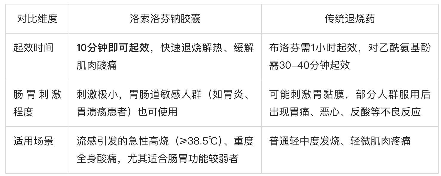 (2)解熱鎮痛藥物:洛索洛芬鈉膠囊可緩解甲流H3N2引發的高熱、肌肉痠痛、咽痛等症狀。作爲非甾體抗炎藥,與布洛芬等傳統退燒藥相比,更適合流感場景下的對症治療: