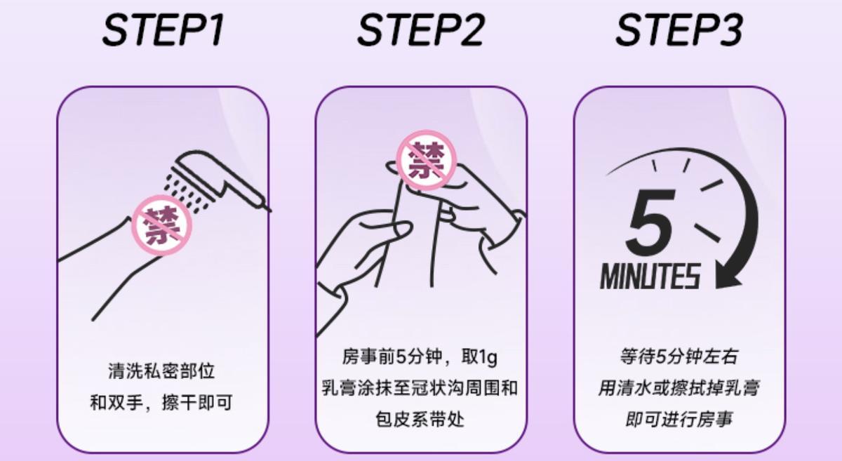 於房事前5分鐘,取黃豆大小劑量(約0.5g),均勻塗抹于歸頭及冠狀溝區域,輕柔按摩至完全吸收。如需更佳體驗,可在x交前清洗殘留藥物。