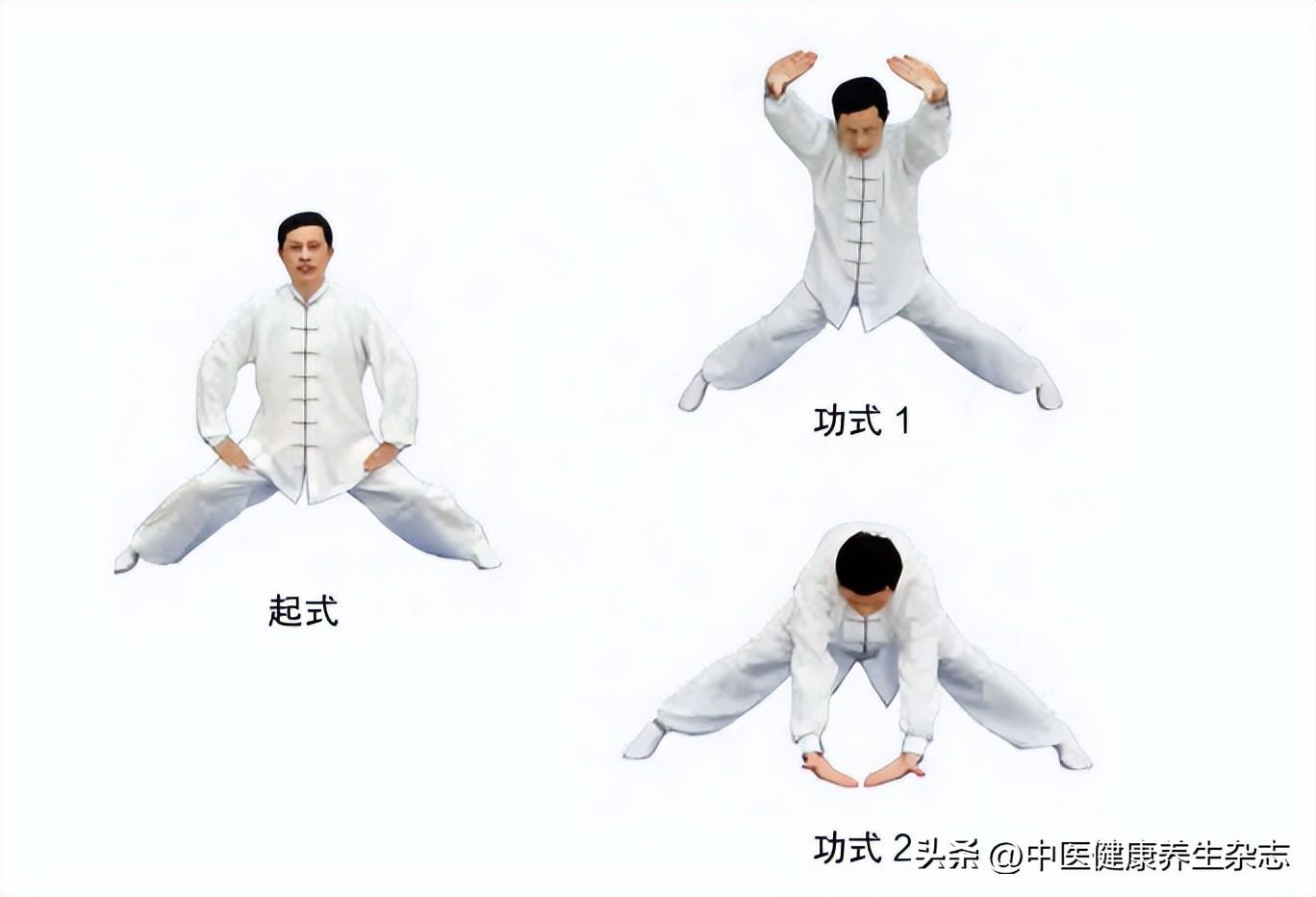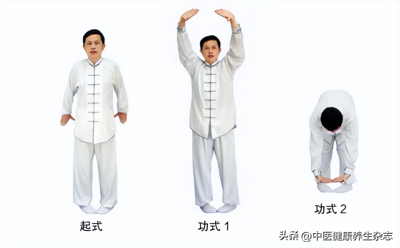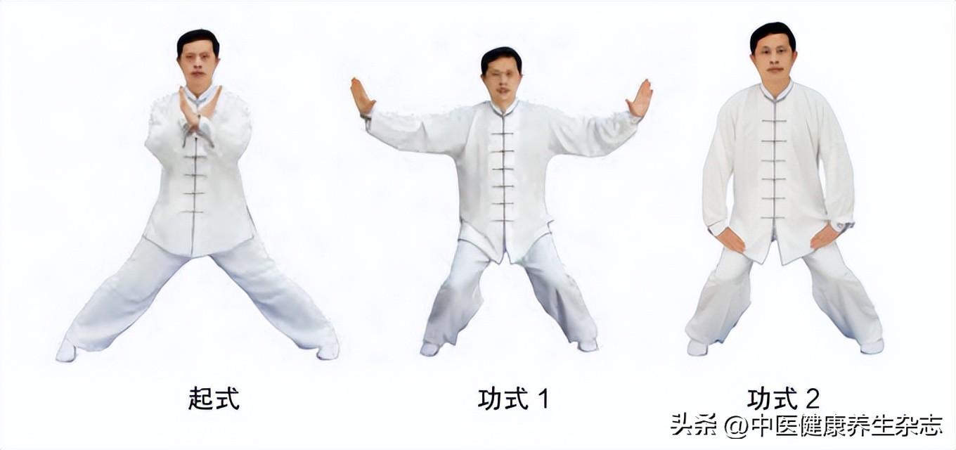 起式:兩腳併攏,頭微屈,如頂重物,兩目平視,口微開,舌頂上齶,下頜微向內收,含胸舒背, 蓄腹收臀直腰,兩手臂自然下垂於身體兩側,五指併攏微屈,中指貼近褲縫,身體正直,心平氣靜。