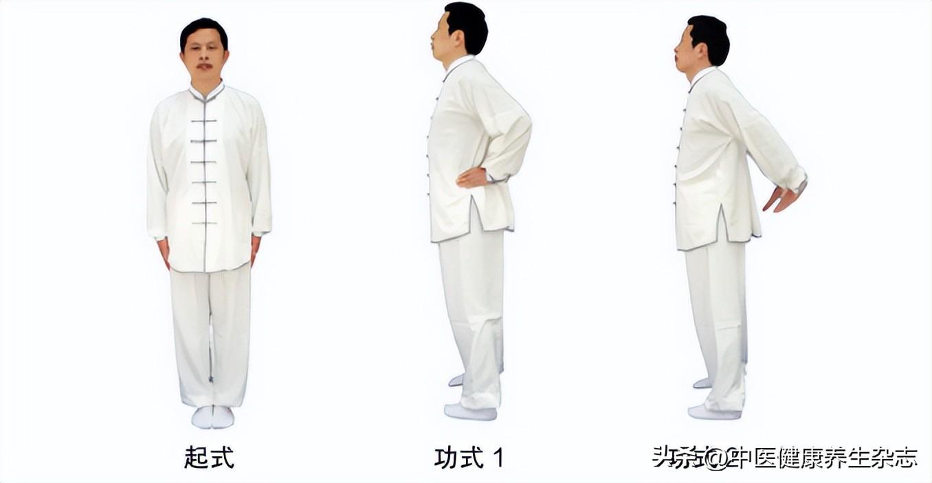 功式:左腳向左平跨一步,兩腳距離略寬於肩部,足尖略收呈內八字,足跟踩地,十趾抓地, 兩腿用力內夾;兩手叉腰,兩拇指按在腎俞穴上, 兩肘夾緊,前胸微挺;兩手後伸,伸直肘和腕, 四指併攏,拇指外展,兩臂向後伸30°;頭勿左顧右盼,精神貫注。