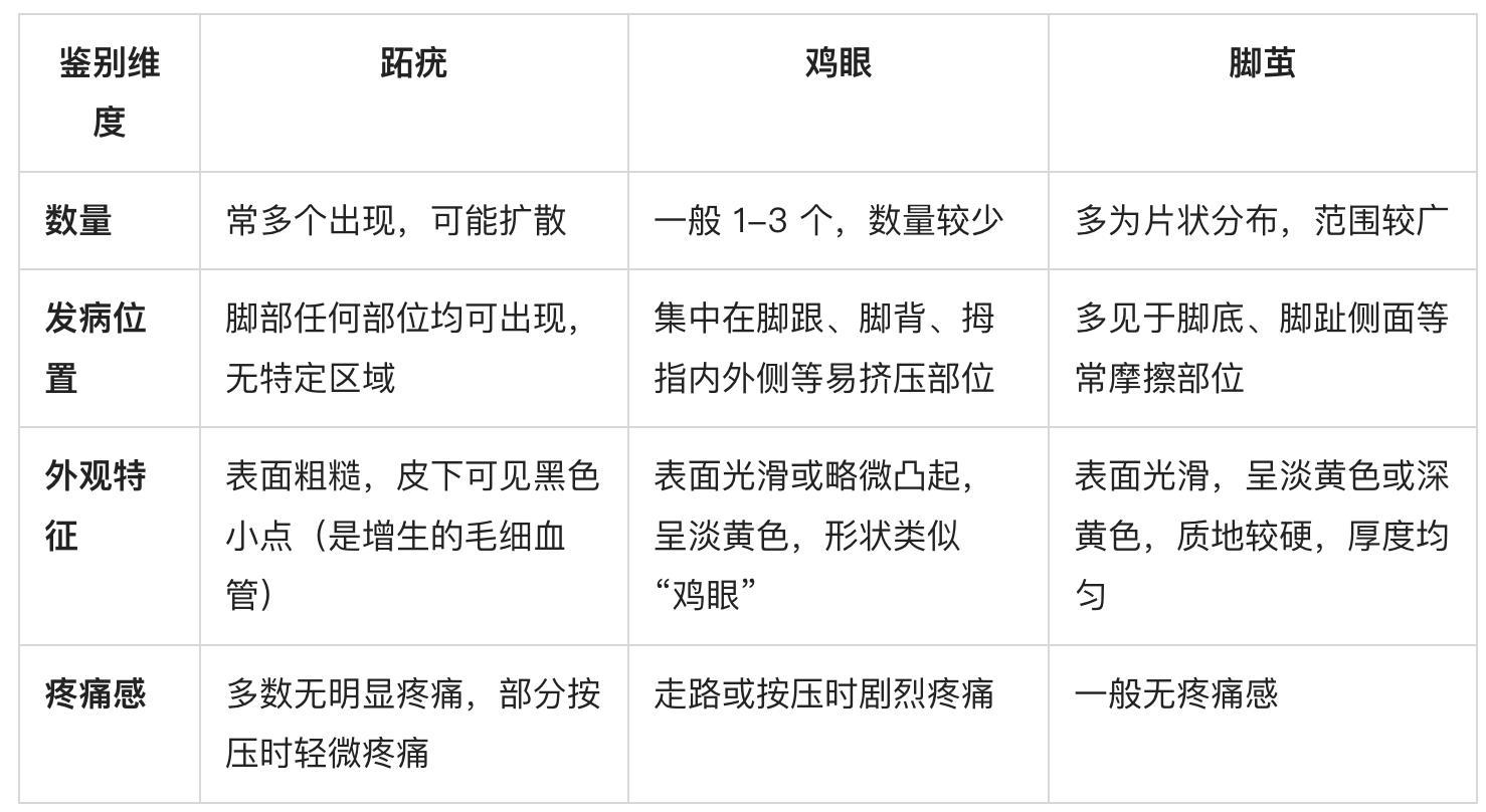 腳底長了小疙瘩,到底是不是疣?很多人會把它和雞眼、腳繭弄混。走路時腳底刺痛、摸起來有硬塊的情況,大概率是這三種腳部問題之一,但它們的成因、危害和處理方式截然不同,盲目處理可能適得其反。蹠疣是病毒感染,會傳染擴散;雞眼是物理摩擦導致,疼痛明顯;腳繭則是皮膚自我保護的產物,一般無需特殊處理。今天就一次性講清楚三者的區別和科學去除方法,幫你對症判斷、精準處理不踩坑。