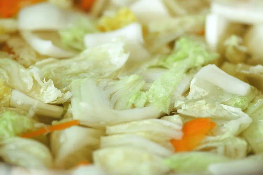 ③ 大白菜切條後焯水,隨後下鍋快炒,加入醃好的瘦肉片與泡發的蝦仁,並添少量清水一同燜煮;