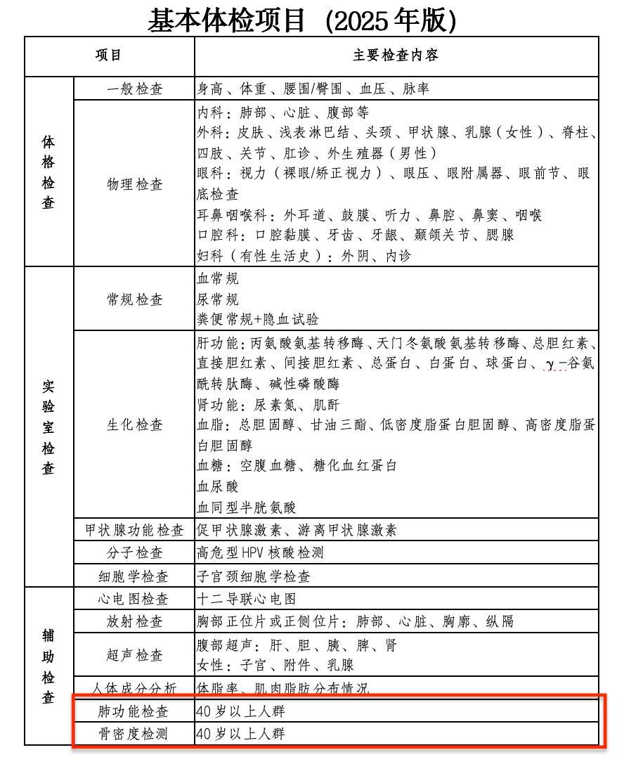 很多人每年體檢都在糾結:體檢項目一大堆,到底該查什麼?隨着年齡增加,器官也在衰老,查多了怕浪費錢,查少了又怕漏掉重點……國家衛生健康委今年10月底發佈了《成人健康體檢項目推薦指引(2025年版)》,明確推薦了40歲以上必做的兩項檢查。這兩項就是——肺功能檢查、骨密度檢查。