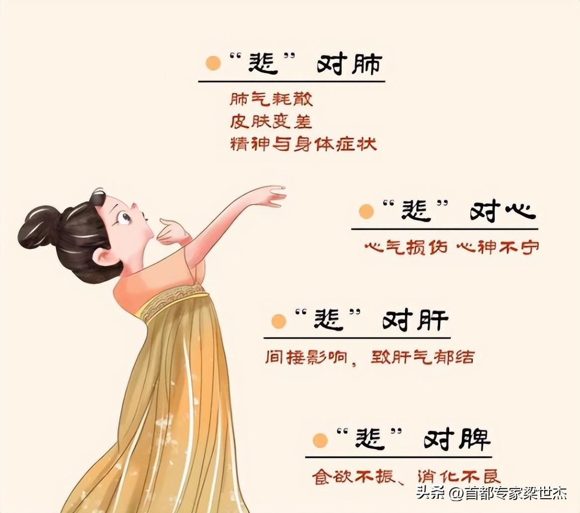 “The lungs are associated with sorrow; excessive sorrow harms the lungs. Sorrow prevails over anger.” This sorrowful emotion is like the dark clouds that can obscure the sunshine within one’s heart. If sorrow becomes overwhelming, it can harm the lungs, just as a flower deprived of water gradually wilts. However, sorrow can also overcome anger. For instance, when you’re in the middle of an argument with someone and suddenly hear something heart-wrenching, the anger dissipates instantly. A patient had a heated argument with a colleague over work-related issues, causing him to tremble with anger. The doctor told him a story of sorrow, and as he listened, tears began to fall, and his anger subsided.
